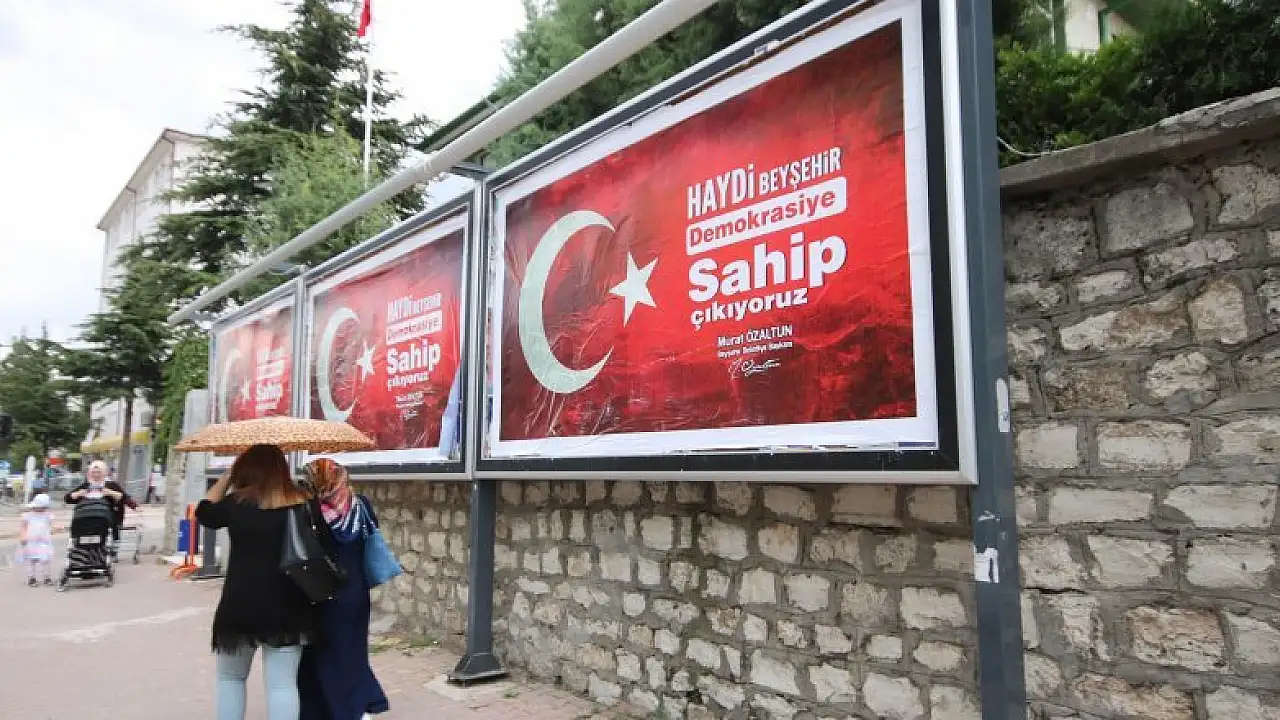 Konya'nın Beyşehir ilçesinde bulunan reklam panolarının tamamı 'Haydi Beyşehir demokrasiye sahip çıkıyoruz' yazılı afişlerle donatıldı.