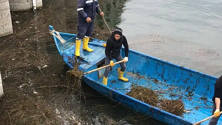 Teknelerden istifade eden ekipler, iki köprü arasında biriken çöp ve atıklar ile ot, kamış ve yosunları toplayarak, gölün yüzeyini daha temiz hale getirdi.