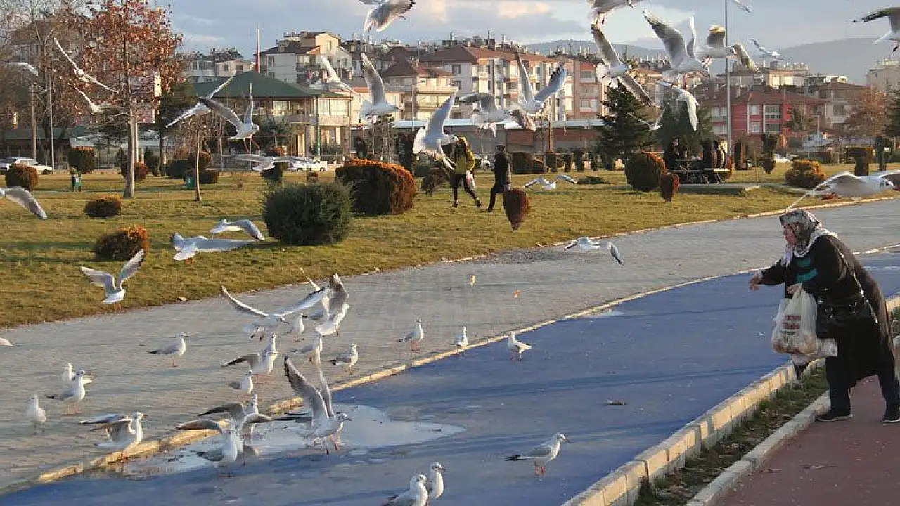 Kıyılara gelen martılar sığ sulara dalarak küçük balıkları avlamaya çalışırken, vatandaşlar ise açlık çeken sürüleri ekmek parçalarıyla besliyor.
