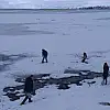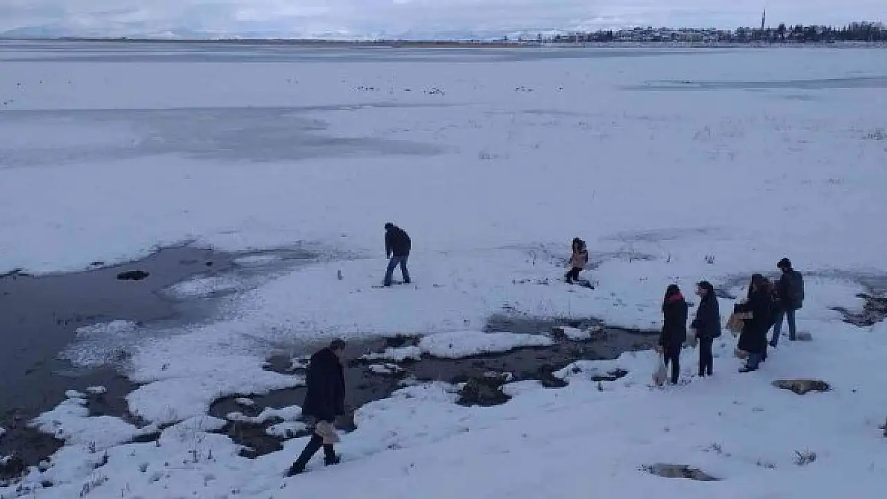 Konya'nın Beyşehir ilçesinde, üniversite öğrencileri buz tutmuş göl kıyısında açlık tehlikesiyle karşı karşıya kalan su kuşlarını besledi.