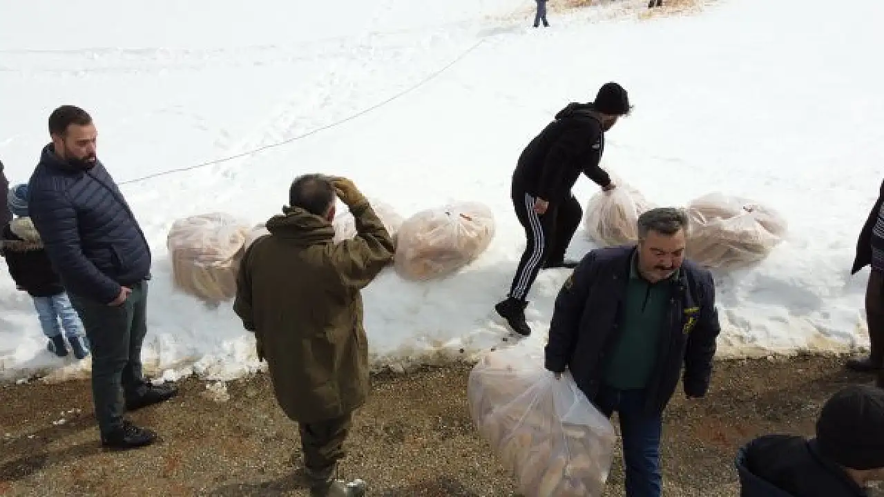 Kar örtüsüyle kaplı alanda ağaç kenarlarına ve uygun alanlara sakatat, bakliyat, arpa, buğday, mısır ve ekmek bırakıldı.
