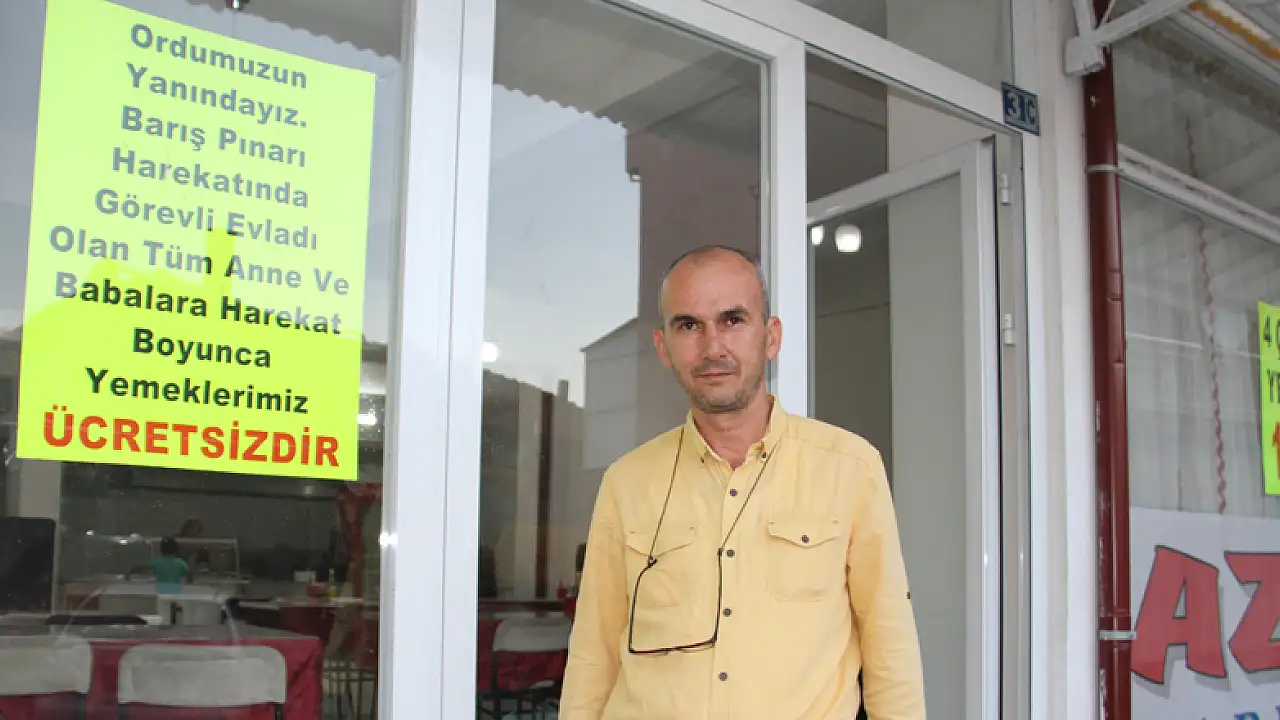 Konya'nın Beyşehir ilçesinde, bir lokanta işletmecisi, Barış Pınarı Harekatı'nda görev alan Mehmetçiğin anne ve babalarından harekat boyunca ücret almayacağını duyurdu.