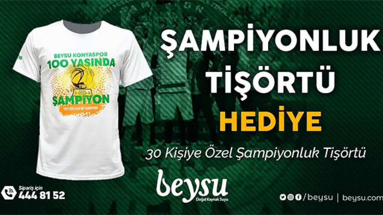 Süper Lig'e yükselen Konyaspor Basketbol takımının isim sponsoru, Konya Büyükşehir Belediyesi KOSKİ'nin bünyesinde faaliyet gösteren "beysu", taraftarlara şampiyonluğa özel üretilen 30 adet "100. Yıl Şampiyonluk Tişörtü"nü sosyal medya üzerinden çekilişle hediye edecek. Hediye teslimleri Konya içerisindeki katılımcılara gerçekleştirilecek. Çekiliş 26 Haziran 2022 23.59’da sona erecek. *Spor Servisi