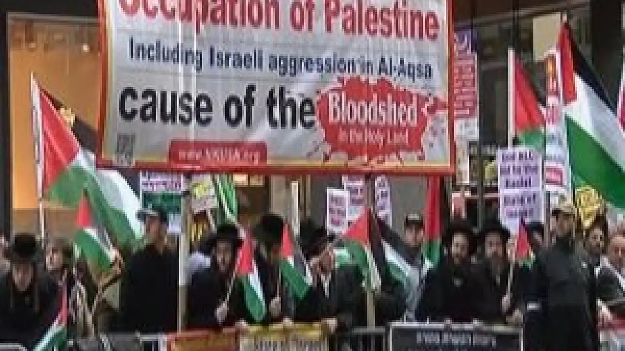 İsrail’in Filistin halkına yönelik şiddet ve Mescid-i Aksa’ya baskınını protesto etmek isteyen binlerce kişi New York’ta bulunan ünlü Times Meydanı’nda bir araya geldi. Çok sayıda Amerikalının ve Ortodoks Yahudi cemaati olan Neturei Karta hahamlarının da katıldığı yürüyüşte İsrail’in saldırgan tavrı protesto edildi. Filistin bayraklarını taşıyan kalabalık grup İsrail’in tutumunu eleştirerek, “Özgür Filistin” sloganları attı, “İsrail Yahudi Halkını Temsil Etmiyor”, “İsrail İşgaline Son”, “Adalet Yoksa Barış Yok” pankartları taşıdı. Kabalık gruba yoldan geçen araçlar da korna çalarak destek verdi.
