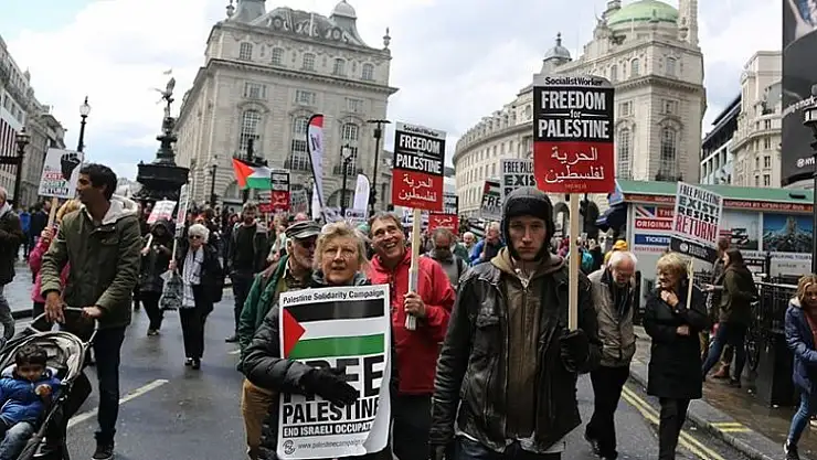Filistin Dayanışma Kampanyası ile Savaşı Durdur Koalisyonunun başını çektiği çok sayıda sivil toplum örgütünün Londra’da gerçekleştirdiği yürüyüşe binlerce gösterici katıldı.