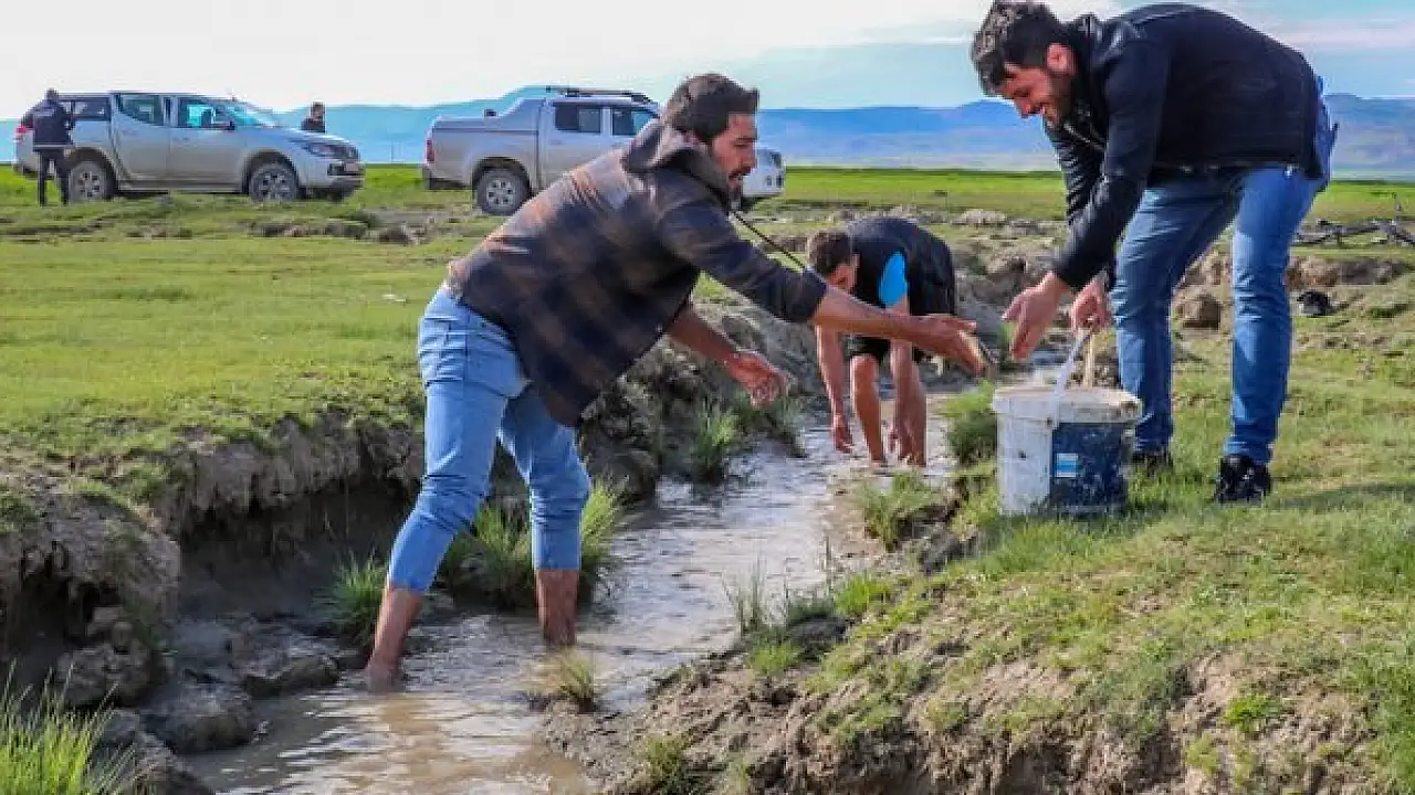 Van'ın Erçek Gölü'nden üremek için akarsulara göç ederken, arklarda sıkışan tonlarca inci kefali ekiplerin zamanında müdahalesiyle ölmekten kurtarıldı.