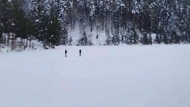 Donan gölet üzerinde yürüyen vatandaşlar bir de ayaklarıyla karın üzerine Bozcaarmut yazdılar. 7'den 70'e herkesin bu doğa harikasını görmek için bölgeye akın ederken, kurulan stantlarda sucuk ekmek yemeği de ihmal etmediler.