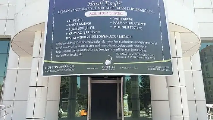 Ereğli yangın bölgelerine destek olmaya devam ediyor. Konuyla ilgili yetkililer tarafından yapılan açıklamada, “Afet bölgelerine gönderilmek üzere Belediyemiz tarafından başlatılan yardım kampanyasına gösterdiğiniz yoğun ilgi ve alaka için teşekkür ederiz. Katkıda bulunmak isteyen vatandaşlarımız Belediye Kültür Merkezimize başvurabilirler. Birlikten kuvvet doğar bu zor günleri el ele vererek anlatacağız” denildi.