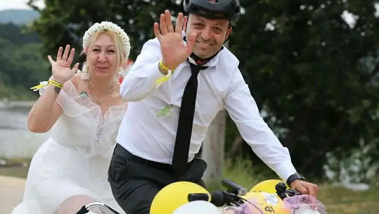 - Bisiklet festivalinde gelinlik ve damatlıkla ön safta pedal çevirdiler