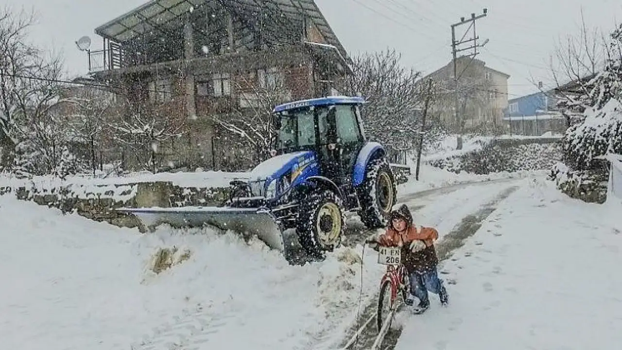 Belediyeden yapılan yazılı açıklamaya göre, Nebihocalar Mahalle Muhtarı Beytullah Tekerli, Kocaeli Büyükşehir Belediyesince sağlanan kar bıçağı ile yollarının açık kalmasını sağlıyor. 9 yaşındaki yeğeni Mesut Uzun ise dayısından gördüğü bu hizmeti, bisikletine monte ettiği tahtadan kar bıçağıyla yapıyor.