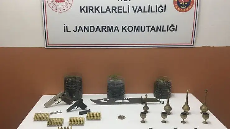 Kırklareli İl Jandarma Komutanlığı Kaçakçılık ve Organize Suçlarla Mücadele (KOM) Şube Müdürlüğü'nce yürütülen çalışmalar kapsamında Demirköy İlçesi İğneada beldesinde M.M. (35) isimli kişinin evinde arama yapıldı. Aramada Bizans dönemine ait olduğu değerlendirilen; 4 adet bronz sikke, 4 adet bronz kadeh, 4 adet gülabdan (koku kabı), 2 adet ruhsatsız tabanca, 215 adet tabanca fişeği, 1 adet pala ile birlikte bir miktar saksılara dikilmiş halde kenevir bitkisi ele geçirildi. Gözaltına alınan M.M. ilgili "2863 Sayılı Kültür ve Tabiat Varlıkları Kanunu', "2313 Sayılı Uyuşturucu Maddelerin Murakabesi Kanunu" ile "6136 Sayılı Ateşli Silahlar ve Bıçaklar Kanununa Muhalefet" suçlarından soruşturma başlatıldı.