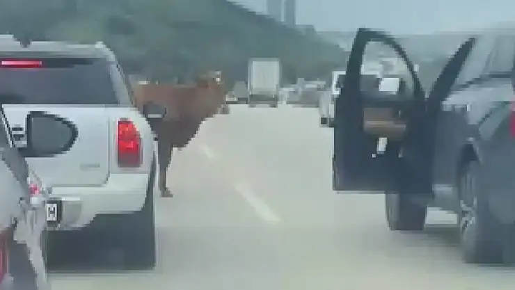 Bursa'da otobana çıkan boğa, sürücülere zor anlar yaşattı. Boğa, araçlarından inen sürücülerin müdahalesiyle yol kenarına alınırken, o anlar ise cep telefonu kamerasına yansıdı.