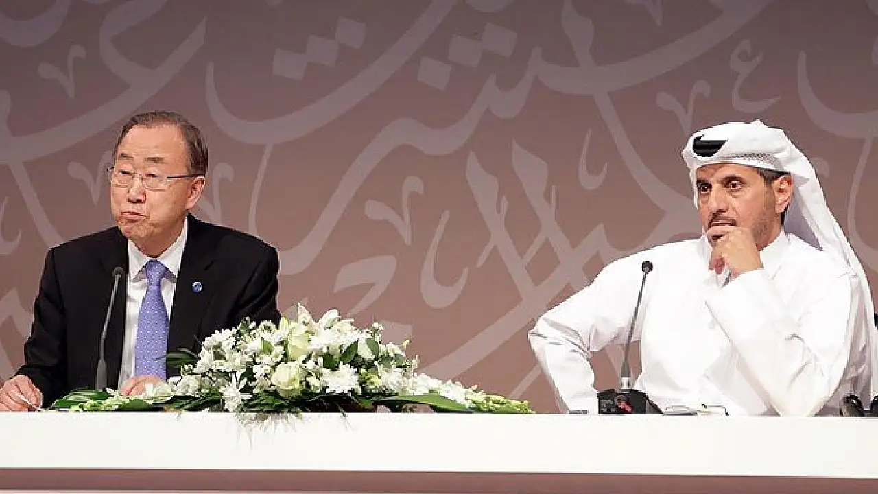 Ban, Katar'ın başkenti Doha'da gerçekleştirilen BM 13. Suçun Önlenmesi ve Ceza Adaleti Kurultayı'nın ilk günün ardından, kurultaya başkanlık eden Katar Başbakanı Abdullah Nasır bin Halife Al Sani ile ortak basın toplantısı düzenledi.