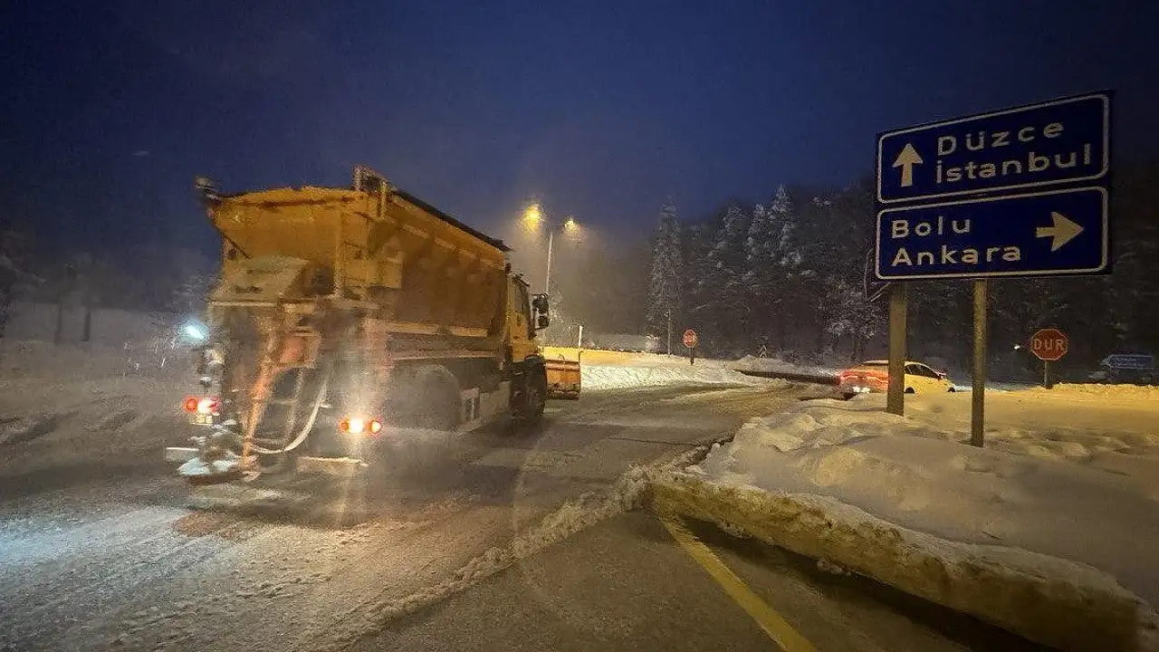 Karayolları ekipleri, D-100 kara yolunun Elmalık, Bolu Dağı Polisevi ile geçişin Düzce kesiminde yer alan Bakacak, Bıçkıyanı, Taşaltı ve Kaynaşlı kesimlerinde kar küreme ve tuzlama çalışmalarıyla ulaşımın devamlılığını sağlıyor.
