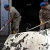 Askerlerin bir kısmı ellerine aldıkları kürek ve el arabaları ile dükkanların içini temizlerken, bir kısmı da yapılan iş bölümü sonucu diğer işlere koşuyor.