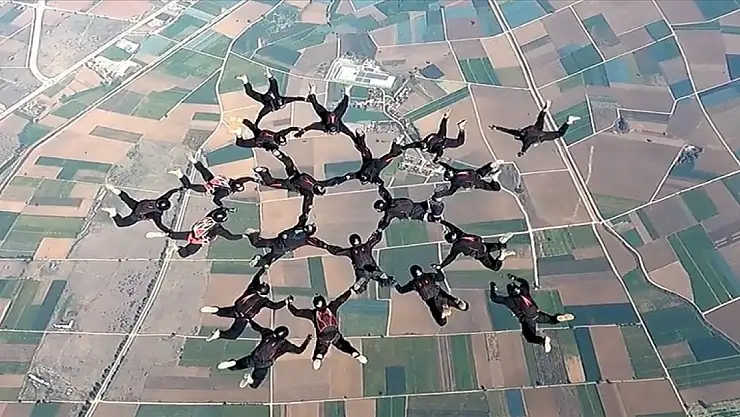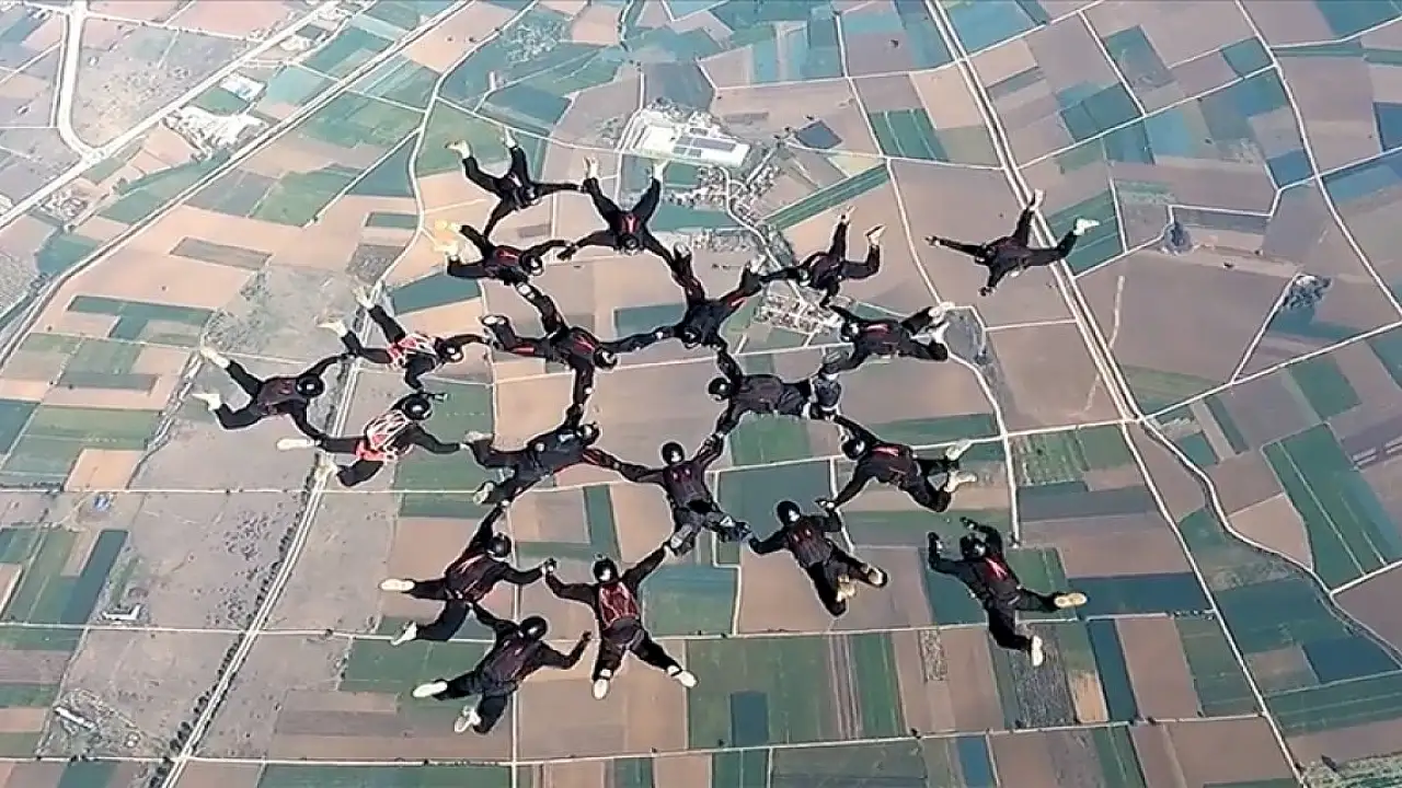 Paylaşımdaki görüntülerde askerlerin uçaktan atlayışı ve gökyüzünde birbirlerine tutundukları anlar yer alıyor.
