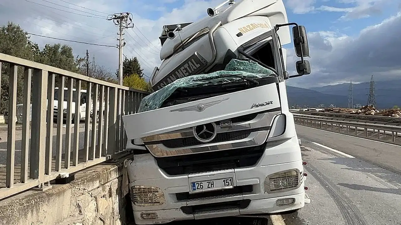 Sakarya'nın Pamukova ilçesi D-650 kara yolunda kamyonun sıkıştırıp yoldan çıkarttığı tır beton bariyerlere çarptı. Yaralananın olmadığı kaza saniye saniye güvenlik kamerasına yansıdı.