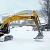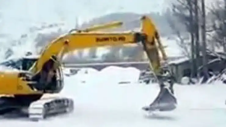 Kafasına taktığı kask ve iş tulumu ile iş makinesinin etrafında 2 tam tur atan vatandaş, üçüncü turu attığı sırada şamriyelin üzerinden fırlayarak kar içinde yaklaşık 10 metre sürüklendi.