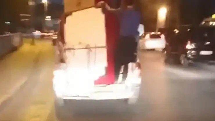 Diğer sürücülerin hayatını tehlikeye atan sürücü, trafik kurallarını umursamadan yoluna devam etti. Başka bir kişi ise pikabın arkasına binerek yükledikleri eşyaları tuttu. Pikabın kasasındaki kişinin zaman zaman bir eliyle işaret ederek trafikteki diğer sürücüleri yönlendirdiği görüldü. O anları, trafikteki başka bir sürücü cep telefonu kamerasıyla kaydetti.