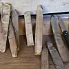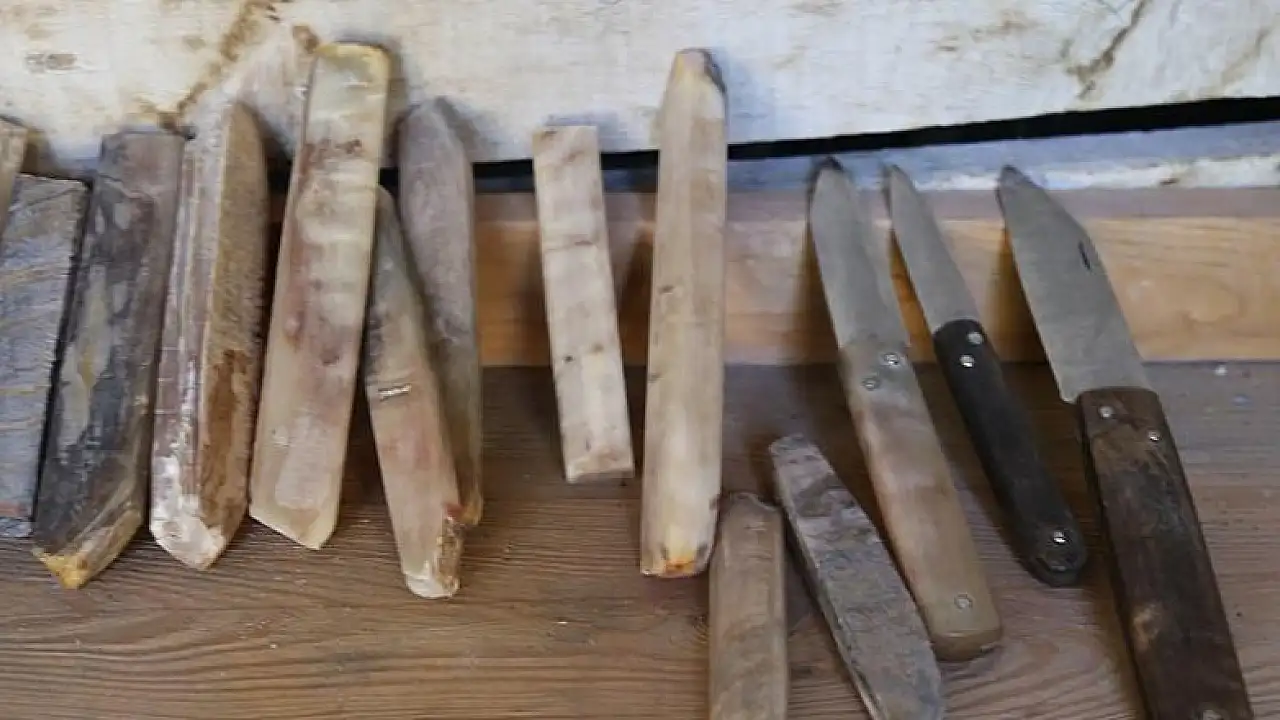 "Bıçak sapı yaptığım boynuzları genellikle kasaplardan alıyorum, çevremdekilerden koç ve keçi boynuzu oluyor ama en çok kasaplar veriyor. Sap yaparken hayvanların boynuzlarını kullanıyorum, boynuzdan güzel sap oluyor. Boynuzdan sağlam olan demirdir ama o da bıçak sapı için ağır oluyor. Sapı boynuzdan olan bıçaklar demir saplı bıçaklara göre daha hafif. Onun için bıçak sapı yaparken boynuzları tercih ediyorum."