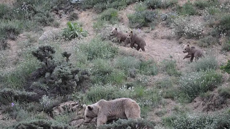 Tunceli'nin Pülümür ilçe merkezine 500 metre uzaklıkta bozayı ve yavruları, fotoğraf karesine yansıdı.