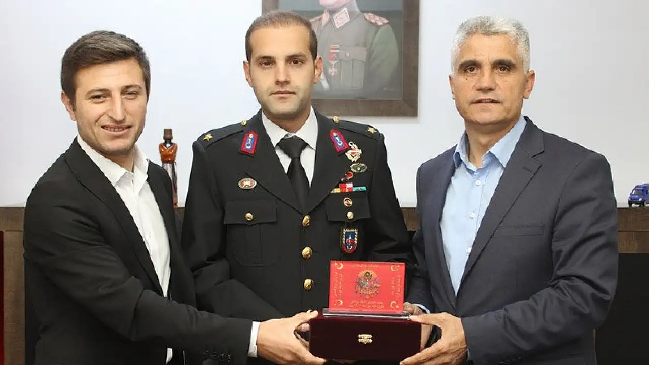 Bozkır Kaymakamı Fahri Onay ve Belediye Başkanı İbrahim Gün, Garnizon Komutanlığına yeni atanan Teğmen Batuhan Duran'a 'hayırlı olsun' ziyaretinde bulundu.