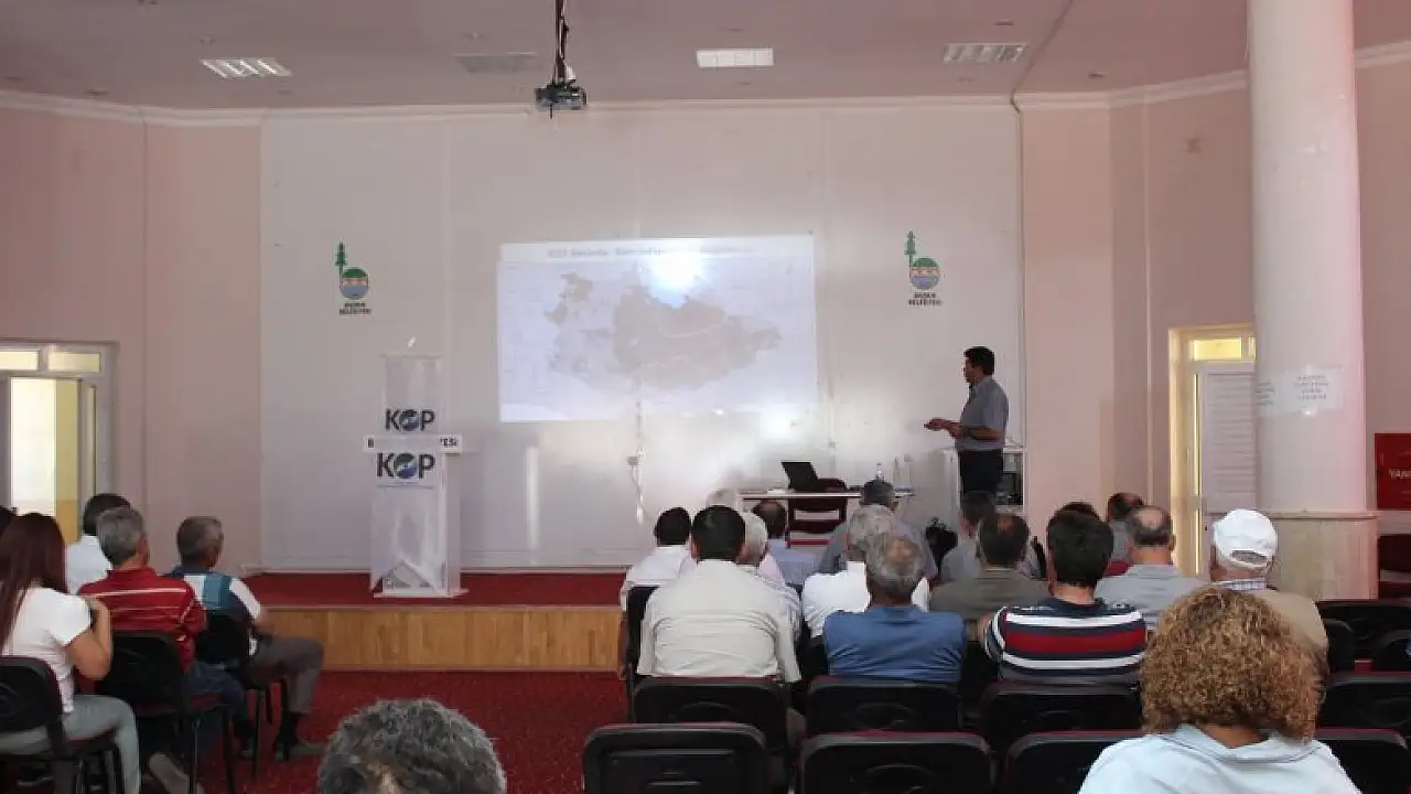 Bozkır Belediyesi düğün salonunda, KOP İdaresi tarafından, Kırsal dezavantajlı konularda tarımsal kırsal kalkınmaya yönelik model geliştirilmesi ve elma, kiraz, üzüm ve çilek meyvelerinde değer zinciri analizi, araştırma ve etüt projesi hakkında istişare toplantısı düzenlendi.