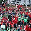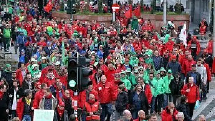 Brüksel şehir merkezindeki Kuzey Tren İstasyonu'nda sendikaların çağrısıyla toplanan yaklaşık 60 bin kişi, merkez sağ hükümetin haftalık çalışma saatlerini 38'den 45'e çıkarmaya yönelik düzenlemesine ve emeklilik yaşının 65'den