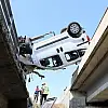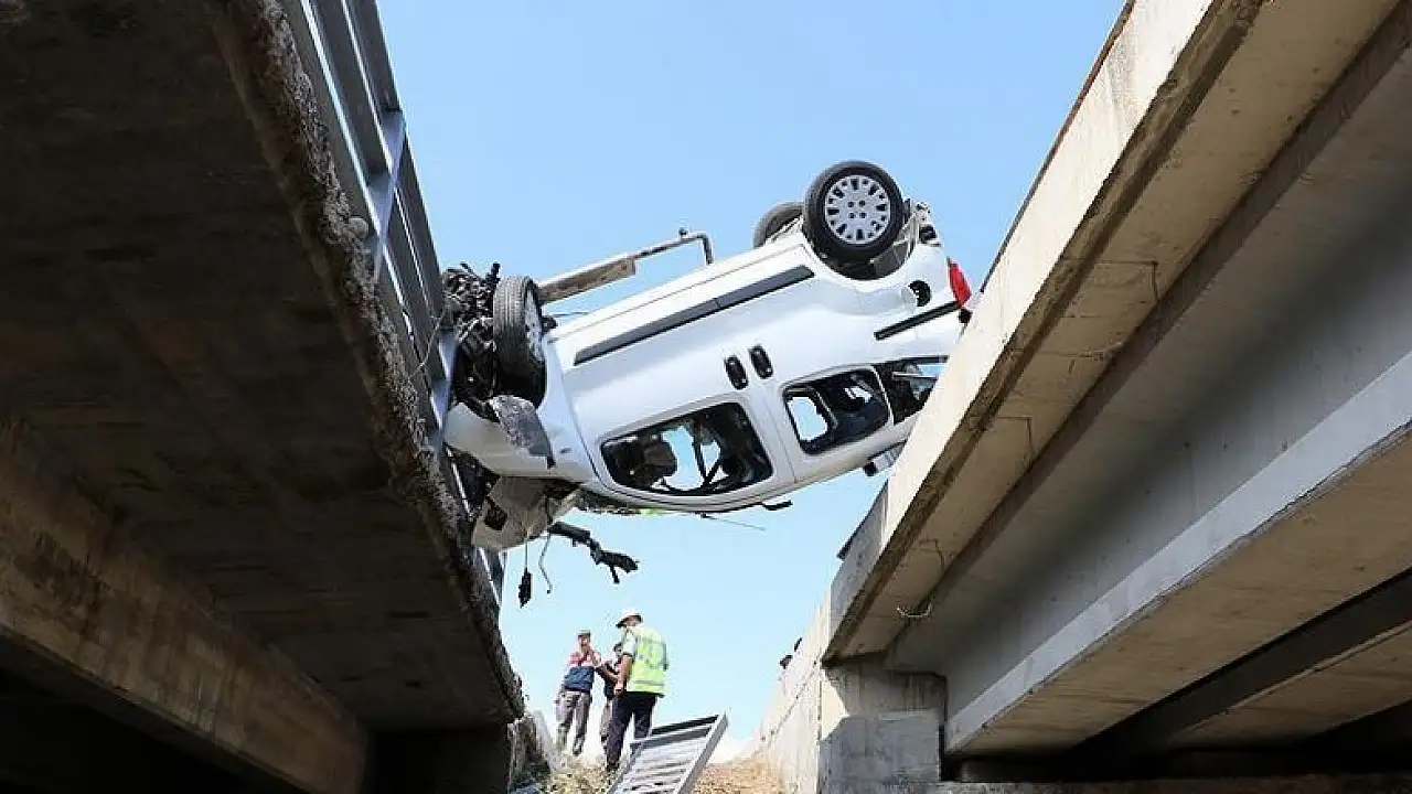 Yolun gidiş ve geliş şeritlerindeki iki köprü arasında kalan araç, 2 kurtarma aracıyla bir saatlik çalışmayla çıkarıldı.