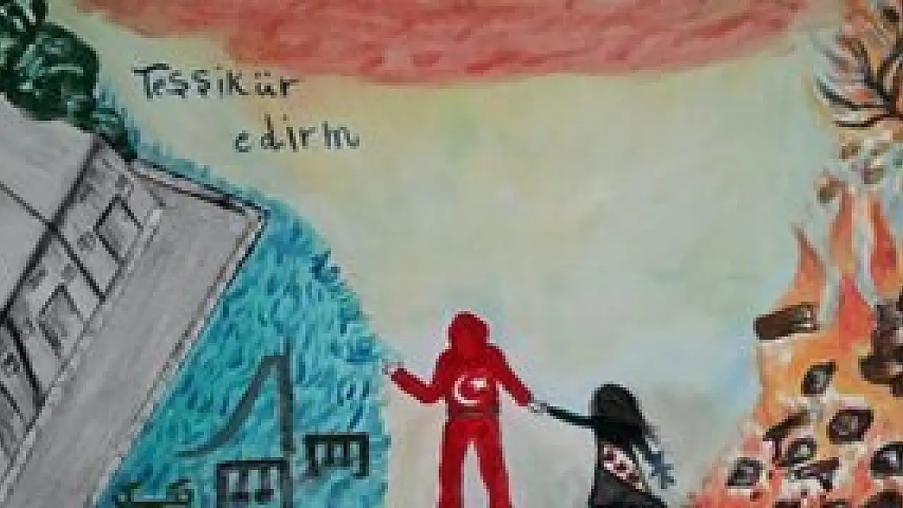 Geçtiğimiz günlerde İnsan Hak ve Hürriyetleri İnsani Yardım Vakfı Merkezi'nin paylaştığı; Suriyeli çocuğun içinden geçenleri çizdiği resimde savaşın yaşandığı Suriye’de oyuncağı olan kız çocuğunu elinden tutarak, Türk topraklarına gelmesi konu ediliyor. Küçük kızın, bir tarafta savaş ve ateş, diğer tarafta park ve binaları resmettiği eserde kırık Türkçesi ile "teşşikür ederm" yazması dikkat çekiyor.