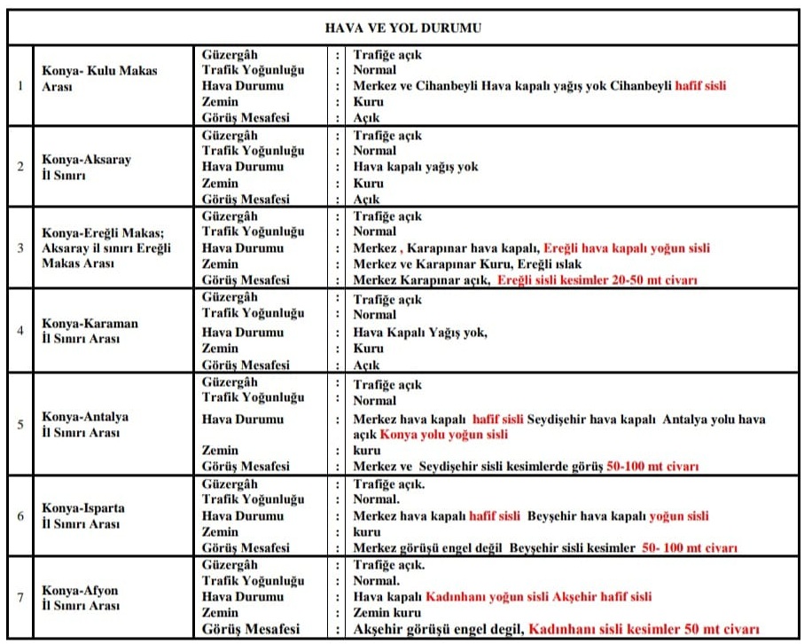 Konya-Kulu makas arası, Konya-Aksaray il sınırı, Konya-Ereğli makas, Konya-Karaman il sınırı, Konya-Antalya il sınırı, Konya-Isparta il sınırı, Konya-Afyonkarahisar il sınırından son durum ne?