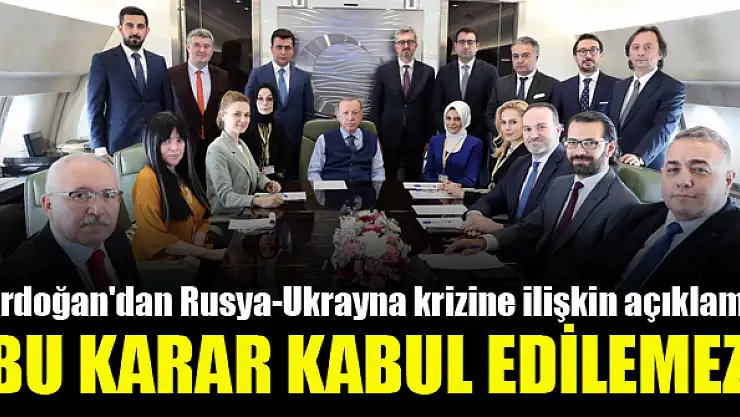 Cumhurbaşkanı Recep Tayyip Erdoğan, Rusya Ukrayna gerilimine ilişkin, 'Biz Rusya'nın kararının kabul edilmez olarak değerlendiriyoruz. Taraflara sağduyu ve uluslararası hukuka riayet çağrımızı yineliyoruz.' dedi.