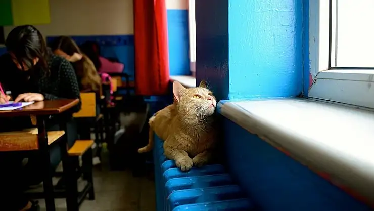 Eskişehir'de soğuk kış günlerinde Namık Kemal Ortaokulu'na sığınan kediye, öğrenciler ve öğretmenler sahip çıktı.