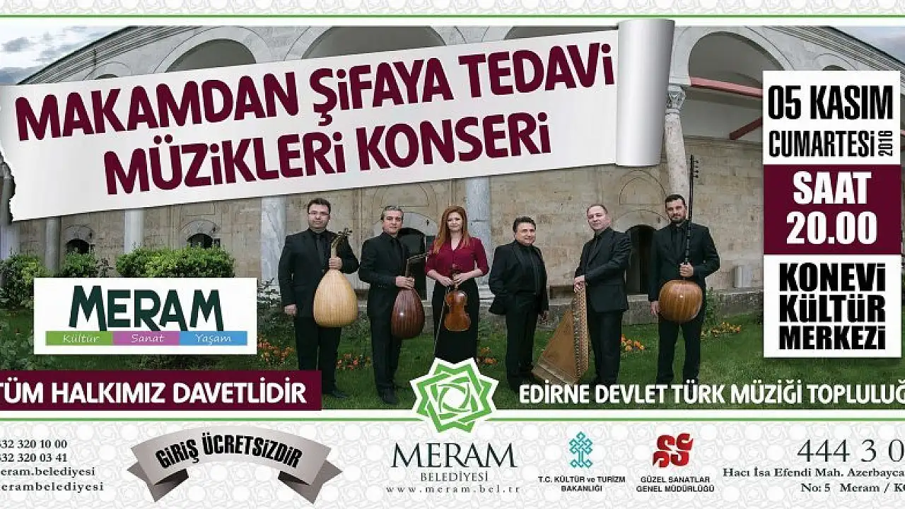 Meram Belediyesi tarafından düzenlenen 'Meram Kültür, Sanat, Yaşam Etkinlikleri' kapsamında cumartesi günü 'Makamdan Şifaya Tedavi Müzikleri' konseri icra edilecek.