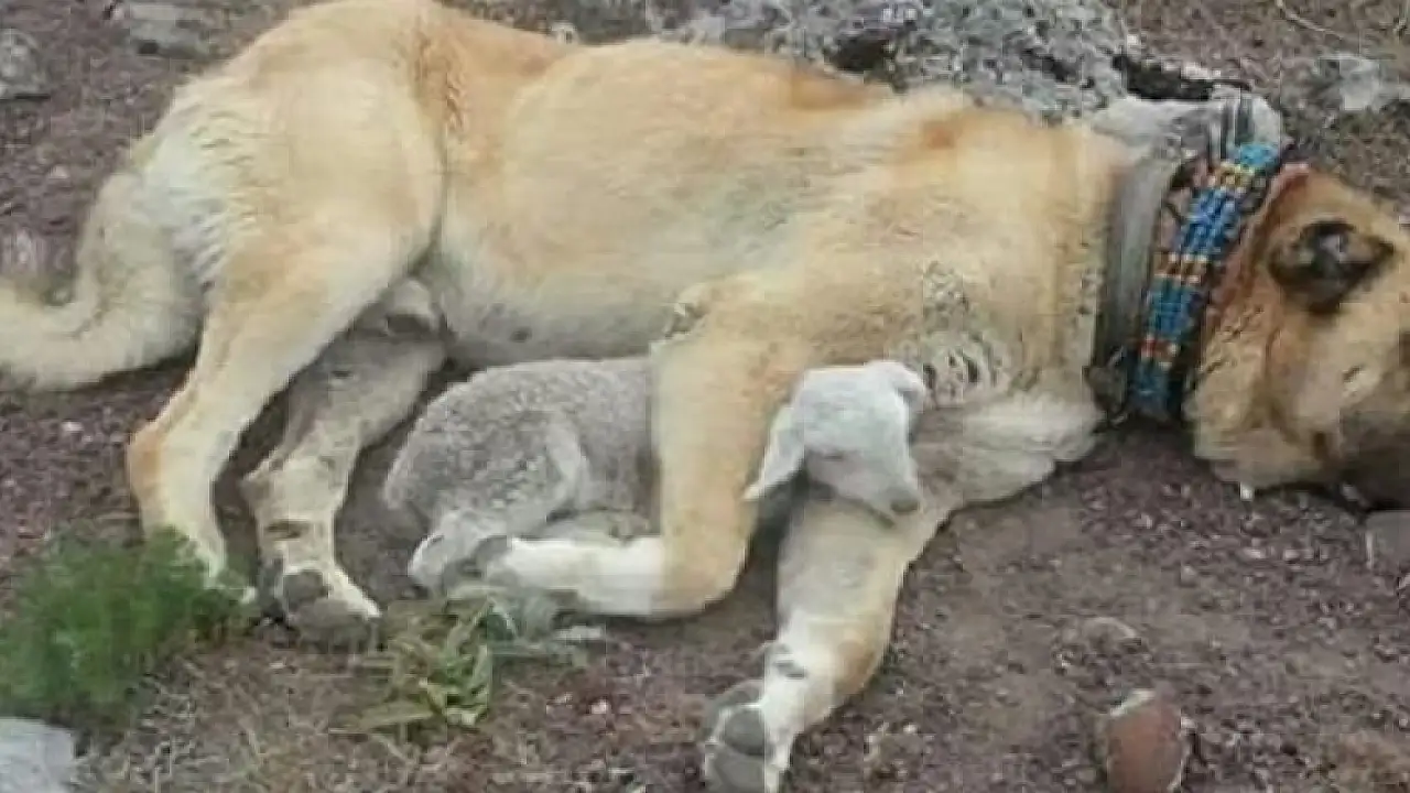 Geri döndüğü arazide arama yapan Hakan Karabacak, köpeğini bir kuzuyu sarmış vaziyette yatarken buldu.