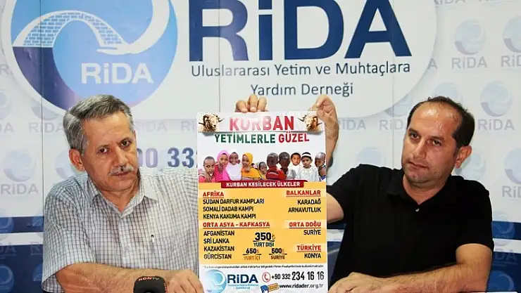 RİDA Uluslararası Yetim ve Muhtaçlara Yardım Derneği bu yılda kurban programını dünyanın 11 ülkesinde organize ederek “KURBAN YETİMLERLE GÜZEL” sloganıyla binlerce kurban hissesi ile yetimlerin ve mazlumların yanında olacak. Yurtdışı Kurban bedelini 350 tl, Yurtiçi Kurban Bedeli 650 tl ve Suriye Kurban Bedeli 500 tl olarak belirleyen dernek, Kurban 2016 programının açıklandığı bir basın toplantısı düzenledi.