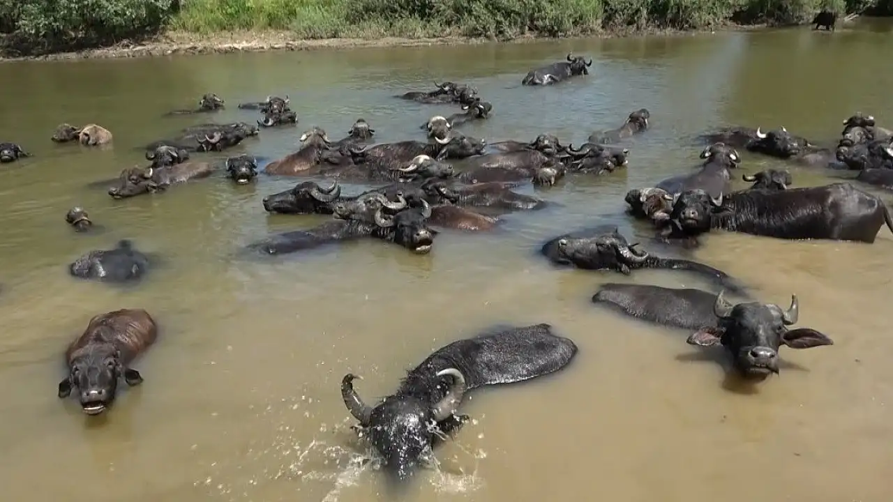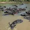 Muş'ta sıcaktan bunalan mandalar, Afrika'yı aratmayan görüntülerle Karasu Nehri'nde serinliyor.