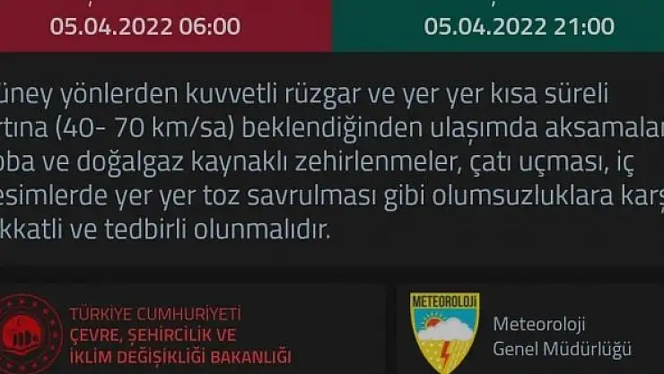 Meteoroloji Genel Müdürlüğü'nden alınan bilgilere göre, Burdur'da yarın için kuvvetli rüzgar ve fırtına uyarısı yapıldı. Vatandaşlar fırtınadan kaynaklı olumsuzluklara karşı uyarıldığı açıklamada, "Güney yönlerden kuvvetli rüzgar ve hızı saatte 40-70 kilometre olan fırtına bekleniyor. Ulaşımda aksamalar, soba ve doğalgaz kaynaklı zehirlenmeler, çatı uçması, iç kesimlerdeki toz savrulmalarına karşı tedbirli olunmalıdır" ifadeleri yer aldı.