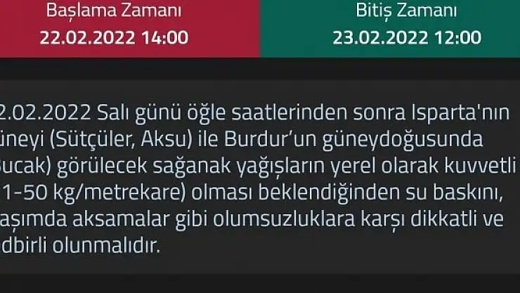 Meteoroloji 4. Bölge Müdürlüğü Tahmin ve Uyarı Merkezi tarafından yapılan açıklamada, "Yapılan son değerlendirmelere göre 22.02.2022 Salı günü öğle saatlerinden sonra Isparta'nın güneyi (Sütçüler, Aksu) ile Burdur'un güneydoğusunda (Bucak) görülecek yağışların yerel olarak kuvvetli (21-50 kg/metrekare) olması beklendiğinden sel, su baskını, ulaşımda aksamalar gibi olumsuzluklara karşı dikkatli ve tedbirli olunması gerekmektedir" ifadelerine yer verildi.
