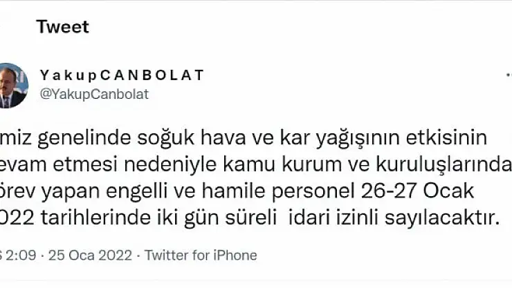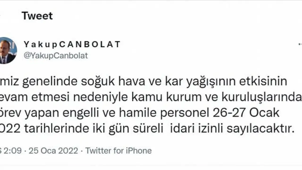 Bursa Valisi Canbolat'ın sosyal medya hesabından yaptığı açıklamada, "İlimiz genelinde soğuk hava ve kar yağışının devam etmesi sebebiyle kamu kurum ve kuruluşlarında görev yapan engelli ve hamile personel, 26-27 Ocak 2022 tarihlerinde iki gün idarî izinli sayılacaktır" ifadelerini kullandı.