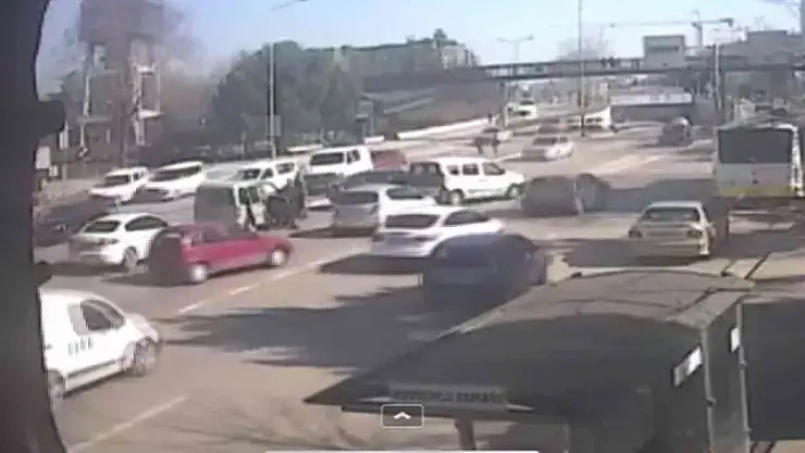 Bursa'da üst geçit yerine ana yoldan karşıya geçmek isteyen iki yaya trafiği savaş alanına çevirdi. 9 aracın birbirine girip trafiği kilitlediği o anlar kameralara anbean yansıdı.