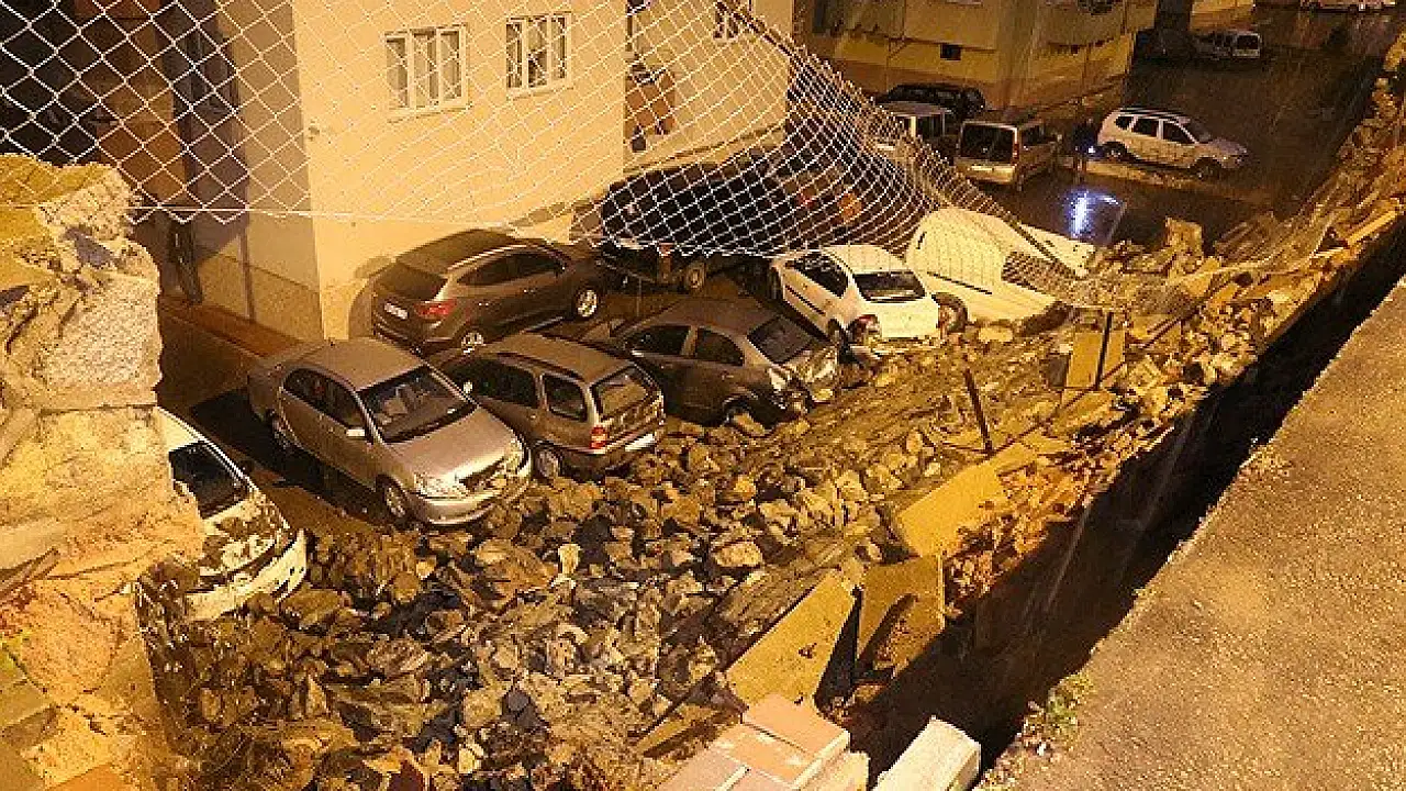 Bursa'da, bir binanın arka bölümündeki istinat duvarının çökmesi sonucu 8 araçta hasar oluştu.