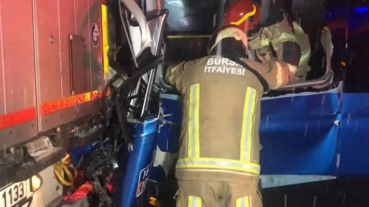 Bursa'da kar yağışı nedeniyle kayganlaşan yolda kontrolden çıkan minibüs, tıra arkadan çarptı.