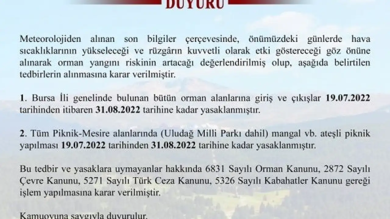 1. Bursa ili genelinde bulunan bütün orman alanlarına giriş ve çıkışlar 19.07.2022 tarihinden itibaren 31.08.2022 tarihine kadar yasaklanmıştır.