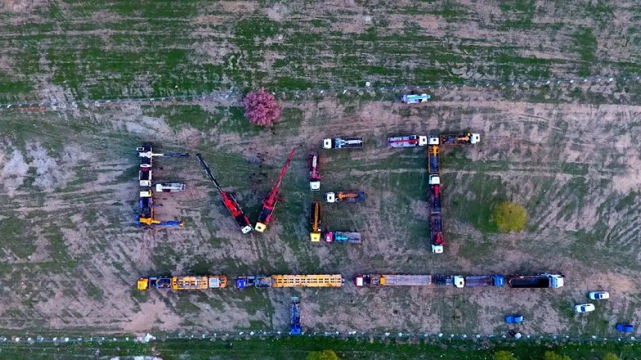 Bursa'da bir grup vinç işletmecisi, referandumda hükümete destek vermek için araçlarıyla 'evet' yazdı.