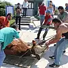 Daha sonra hayvan taşıma TIR'ı plaj yanına getirildi. İşçiler tarafından, ayakları bağlı olan hayvan önce plajda bulunan tahta parçalarının üzerine yatırıldı, daha sonra kuyruğu ve boynuna bağlı iplerle çekilerek TIR'ın yanına getirildi. Eziyete dönüşen taşıma işleminde yerde sürüklenerek TIR'a çekilen hayvan daha sonra araca konularak götürüldü.