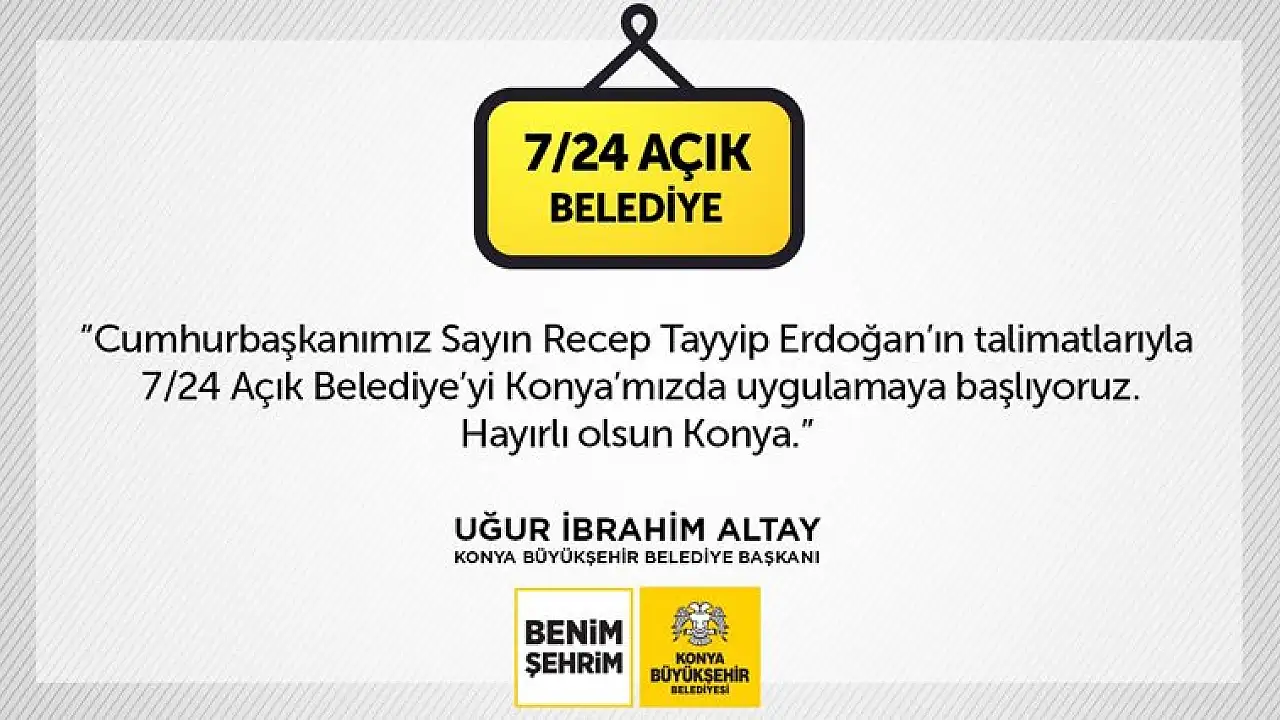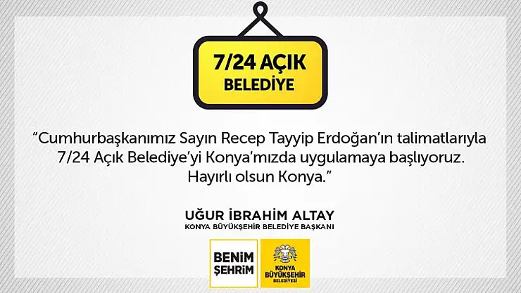 Konya Büyükşehir Belediye Başkanı Uğur İbrahim Altay, Cumhurbaşkanı Recep Tayyip Erdoğan’ın talimatlarıyla 7/24 Belediye’yi Konya’da uygulamaya başladıklarını belirterek, vatandaşların her türlü istek, beklenti, tavsiye ve şikâyetlerini ulaştırabilmeleri için belediyenin kapılarının günün 24 saat açık tutacaklarını, hizmet binasında personel bulundurarak vatandaşlara gece gündüz hizmet vereceklerini söyledi.