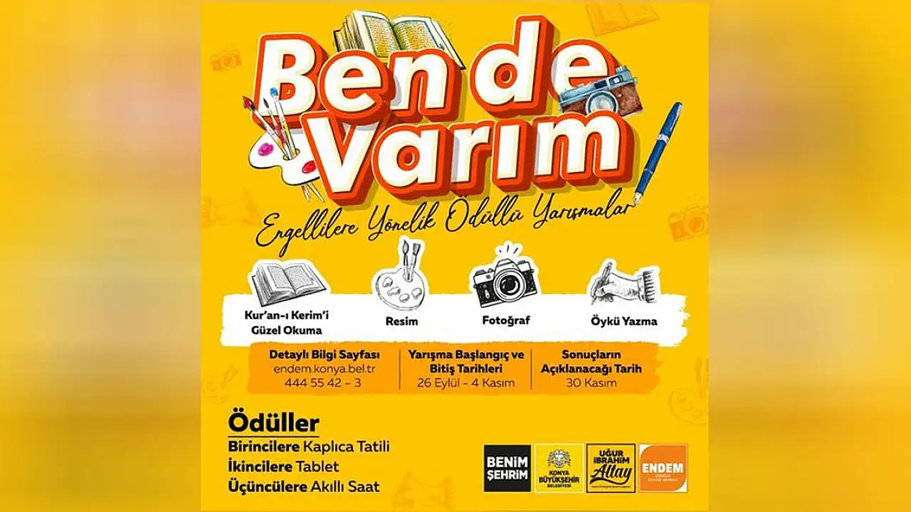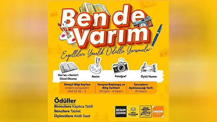 Büyükşehir Belediyesinin özel gereksinim duyan vatandaşlara yönelik "Ben de Varım" temalı, yapılan ödüllü yarışmada Kur'an-ı Kerim'i Güzel Okuma, Resim, Fotoğraf ve Öykü Yazma kategorilerinde düzenlenecek. Yarışmaya son katılım tarihi 4 Kasım olarak belirlendi. Başvurular endem.konya.bel.tr adresinden yapılacak.