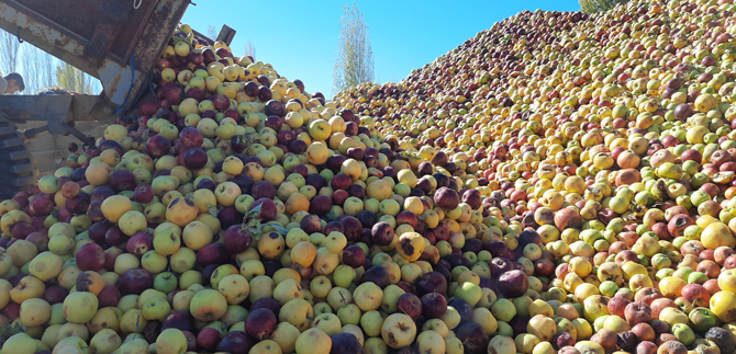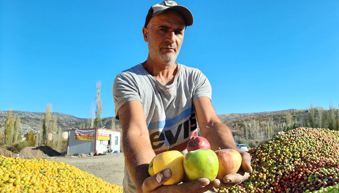 "Yağışların az olması nedeniyle bu sene elmalar ufak kaldı. Elmalar hep döküntüye gidiyor. Bölgemizde neredeyse sandığa hiç elma girmiyor ve hep döküntüye gidiyor. Elmalar, ufak kalınca boşa gitmemesi için dalından çırpılıp döküntüye getiriliyor. Üreticinin durumuna göre kimisi traktörle, kimisi özel araçlarıyla, kimisi çuvalla ve poşetle getiriyor. Sizin anlayacağınız çürüyüp ekonomiye katkısı olmayacak ürünler, çürümeden bize ulaştırılarak ekonomiye kazandırılıyor."
