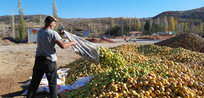 Konya'nın Bozkır ilçesinde, yağışların az olması nedeniyle yeterli büyüklüğe ulaşamayan "döküntü" elmalar, alım merkezlerinde toplanarak meyve suyu üreten fabrikalara ulaştırılıyor.